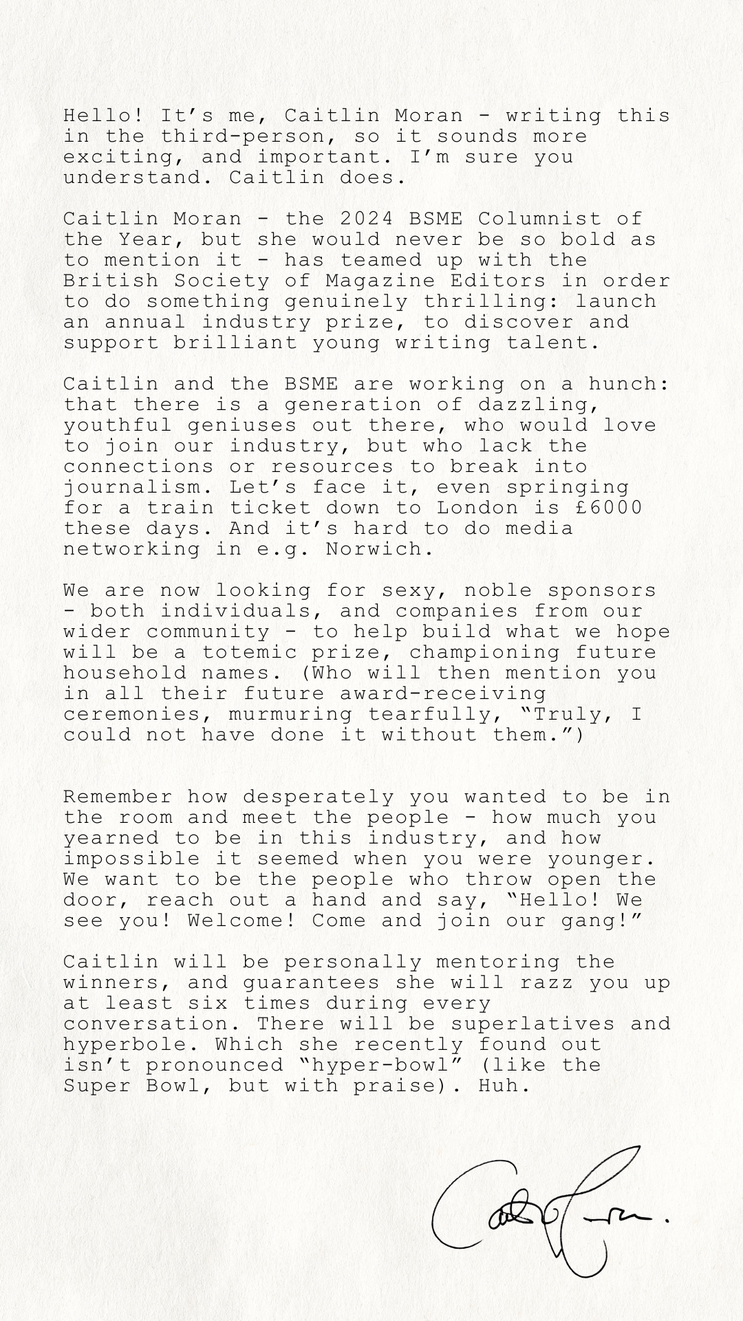Winners will receive not just prize money, but a year of personal mentorship from Caitlin Moran, work experience with leading UK editors, and genuine pathways into the industry.